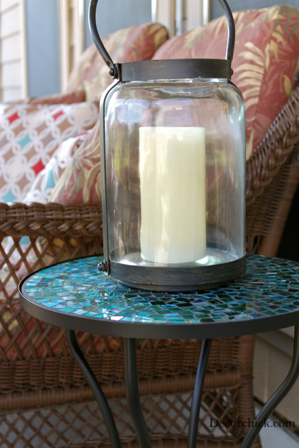 First up is this beautiful turquoise mosaic side table and bronze metal hanging lantern.