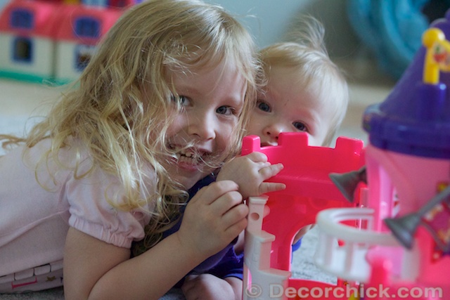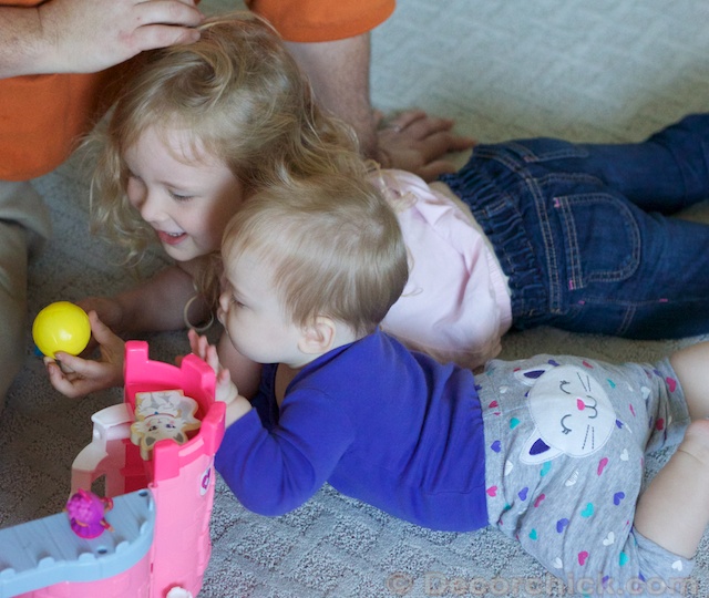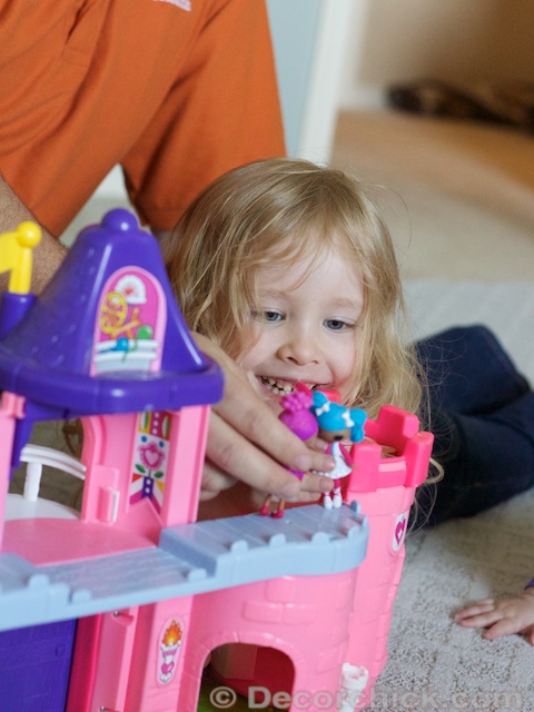 We were playing with the kids the other day on it to see how they liked it and they did. Of course. Ellie had a hay day scooting around everywhere while Emma and Daddy played with the castle.