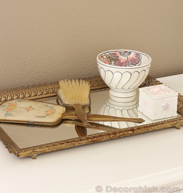 I love this mirrored antique tray and old hand-held mirror and brush I found at the antique store.