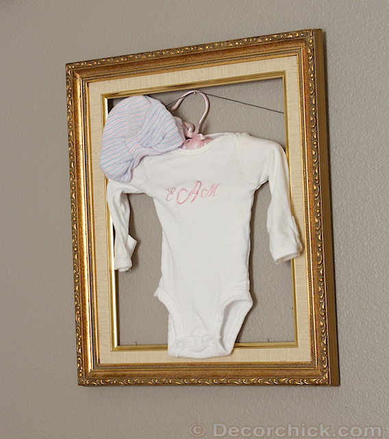 In this frame I hung up the onesie she came home wearing from the hospital, along with the newborn bow hat.