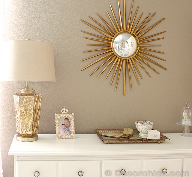 Ok let’s see…the white dresser in her room I already had in a different room, the white crib is the same one Emma used (from Craigslist), the gold starburst mirror I talked about here a long time ago, the bookshelf you’ll see later on is about 50+ years old (a hand me down from my brother, which used to be my aunt’s when she was a kid), and most accessories and frames on the gallery wall are all either from Goodwill, thrift stores, or flea markets. I’ll add a complete source list at the end of the post.