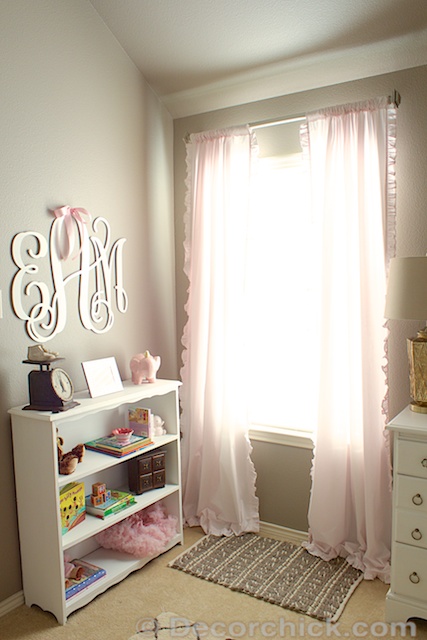 The pink ruffle curtains are from Restoration Hardware Baby & Child. I don’t buy anything there without a 20% coupon FYI. There’s always a sale. :) P.S.-If any of you are RH fans or shoppers, all of the pink and grey’s in this room are their “Petal” and “Dove” color.