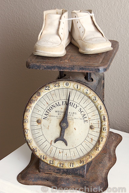 I brought in my old antique scale and put a pair of antique baby shoes (from the antique store) on it.