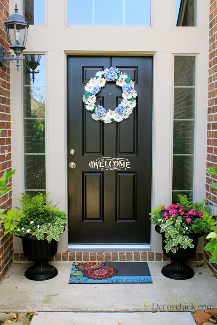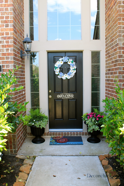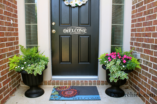 So anyway, that’s about it! Oh I did buy a new doormat at Target for $11 too. The Welcome vinyl sign was done a few years ago as well, and I just had a local sign shop print it out for me and I stuck it on. But if you have a Silhouette you can make one yourself!