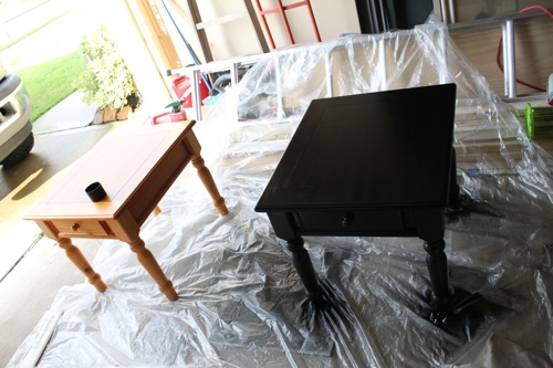 After about 30 minutes of drying I used Rustoleum black spray paint in a satin finish. Highly recommend the black satin. I am in love with how our tables look now, and it went on very evenly.