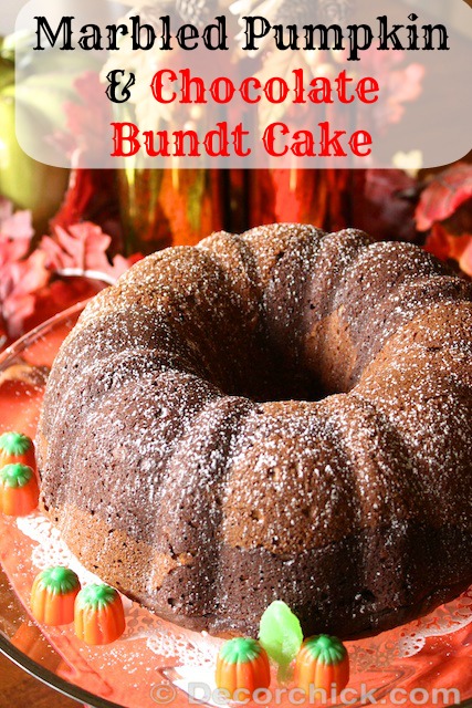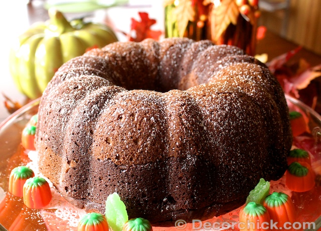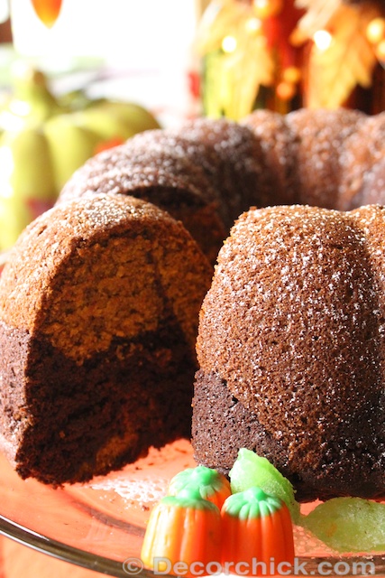 Happy Monday everyone! I decided to throw you all into a tailspin today and post a yummy recipe instead of a boring ole DIY project. ;) Call me lazy, (or call me smart), but I had my mom make this cake for me so I could post it. She had made it for Christmas a few years back and it was really good so I wanted to share it with all of you since it’s perfect for this time of year. It’s called Marbled Pumpkin-Chocolate Bundt cake, and this recipe came from Woman’s Day.