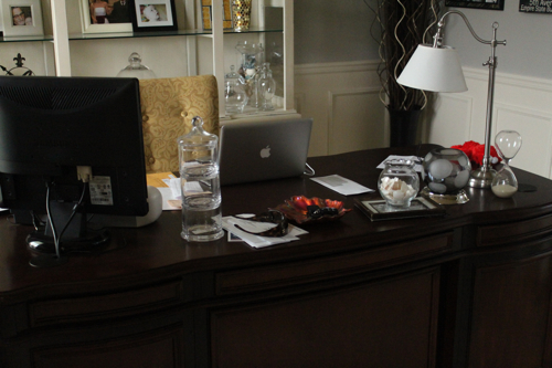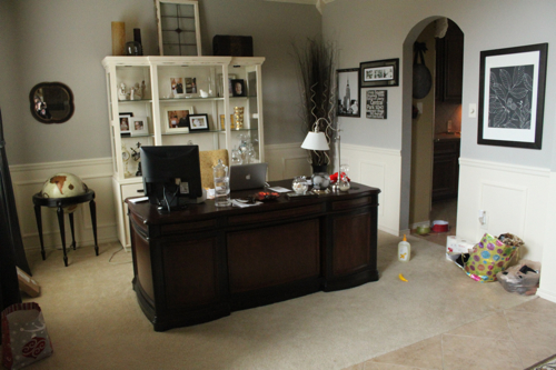 Here’s the office with all sorts of stuff on the desk and Christmas stuff on the floors from ohhhh 3 weeks ago now?
