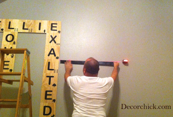 I did this very thing, I used 3″ wood squares from the craft store and used my scrabble game to make sure I was correct with letter number combo. I used my familys names. It says ” our family then last name and every ones name. When wedings and babies come along we add a name. It hangs in the family room.