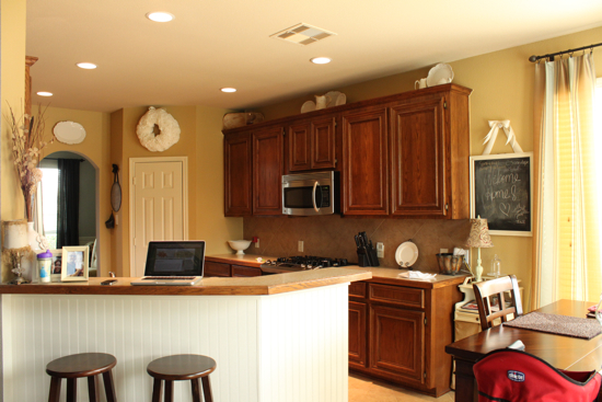 I completely understand how you feel…the first half of our house is light, airy and gray…and then the kitchen is builder’s beige with orange cabinets…yuck! I’m itching to paint the rest as well very soon. I do like how the cabinets look in your kitchen now but I don’t think staining them a bit darker would be a bad idea.