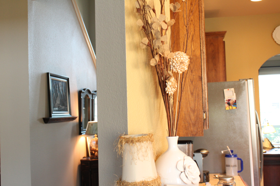 I’m talking about the different shades on the column. Lately I’m just really into a more cohesive feel and really want the rooms to flow better and not be so choppy with multiple colors. It was fine before because we had camel walls everywhere else. But now with the new greige paint everywhere, it was just like BAM, here’s the yellow/golden kitchen that sticks out. Know what I mean?