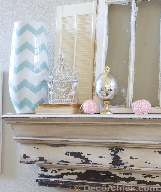 And since I was so on the ball this year, I kept the same things up on the mantel as I had up for Valentine’s Day, but just removed the red rose wreath. Then I scattered about a few more eggs. :)