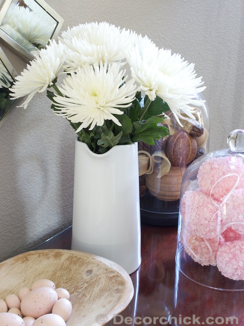 Spring and Easter have totally crept up on me this year. It was only a few days ago when I took down the Valentine’s Day decor! That’s very unlike me but having red and pink and hearts up around the house for a long time was kind of fun. :) So since Easter is ummm, this weekend, all I did was throw up a few faux eggs I had from last year and called it a day.