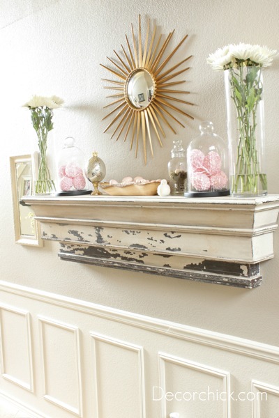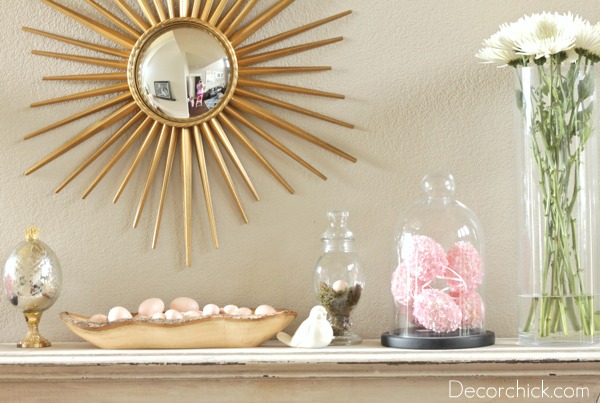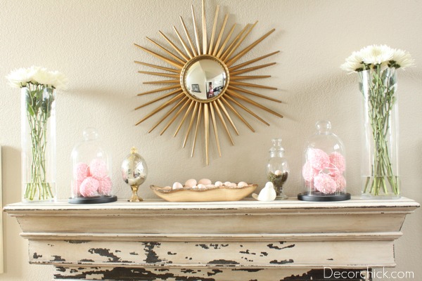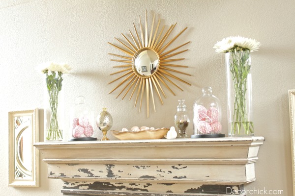 I call it the simple and elegant spring mantel. :)  I love the touches of gold and soft pink together too.  I love love love how the bargain sunburst mirror looks up there too!
