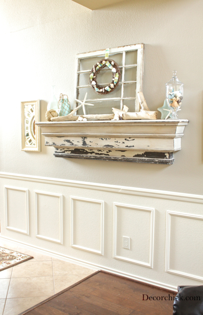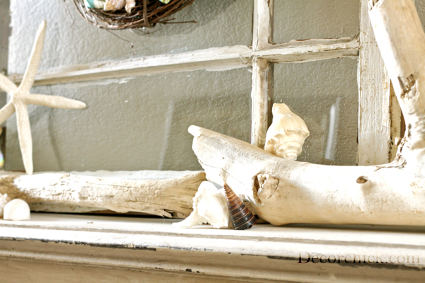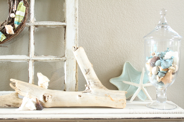 You KNOW I love this mantel! So light, pretty, and beachy! I need to find a big piece of driftwood now!