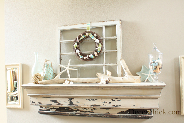 I already had the old antique window and used it for my Fall mantel last year as a backdrop, but this time I just turned it on its side, and made a simple shell wreath to hang on it.