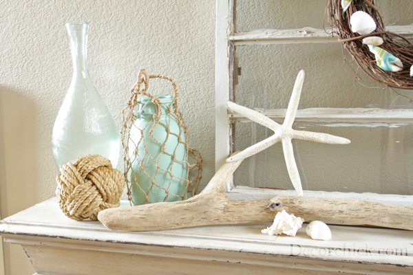 […] driftwood, net packaging, shells and an old window.  Get the full scoop on Emily’s beach themed summer mantel and create your own serene scene in no […]