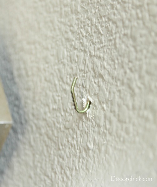 These are called gorilla hooks or monkey hooks, I’ve seen both names. And they are great because all you have to do is stick that one end into the wall and it latches on to something on the inside of the sheetrock (I’m not 100% positive what it does inside the wall), and then you just hang your item! It seriously is the easiest thing ever. Of course if you have a stud, you won’t need this. If you are dealing with just the drywall though, these are perfect and you don’t hammer anything in. It just sticks right in the wall, like magic.