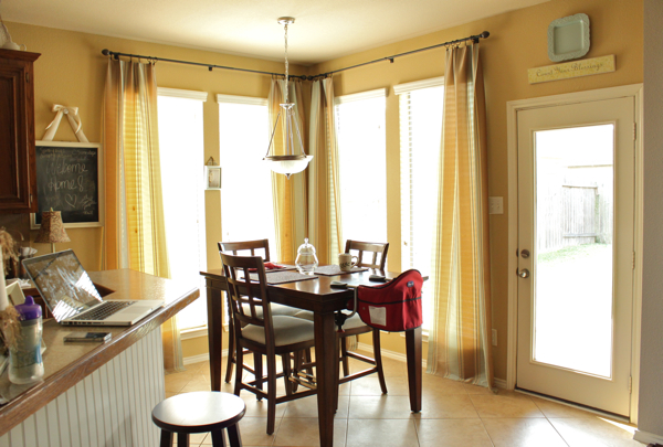 This is waaayyyy FAB!! It feels so clean and open with your new color and drapes. And the rug is awesome– and I’m not usually a fan of rugs under the kitchen table! Kudos. :)