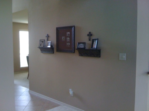 I first added it to a big entry wall which also adjoins the family room. Here is the wall before, and this is pretty much right after we moved in, so it’s still builder beige and very little decorating done.