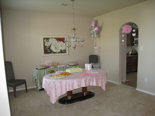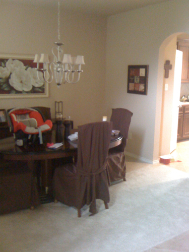 Here is how our dining room looked for about a year after we moved into this beautiful beige home.  I had good reason to not decorate anything immediately though.  We found out I was pregnant 3 days after we moved in, and I was sick as a dog for 3 months.  Seriously I was in bed all.day.long. And this was the only picture I could find of a real “before” and it was from my baby shower.
