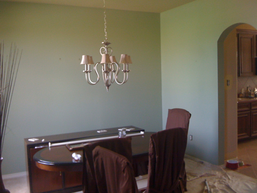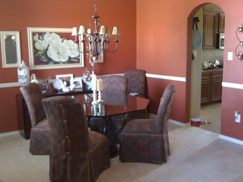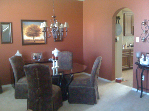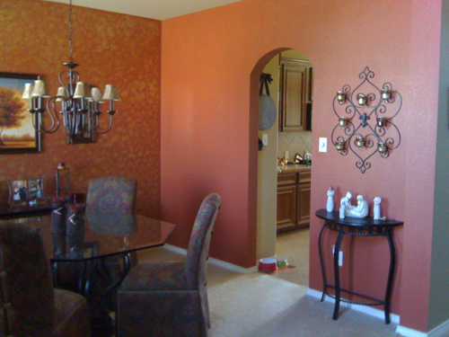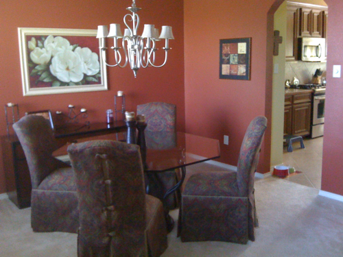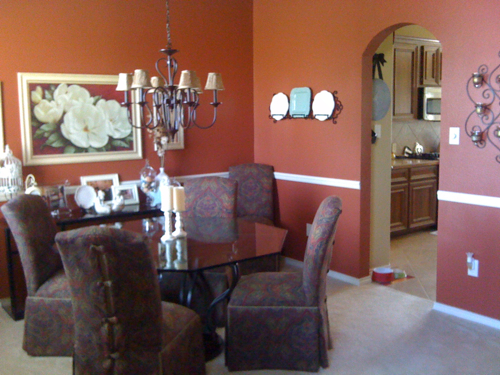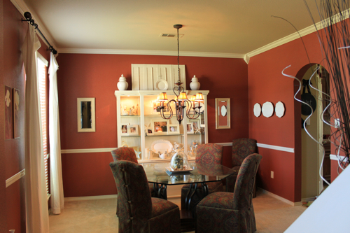 So after my husband got mad at me (he had every reason to be), for hiring someone to paint the mint green and me not testing it out first, he painted the dining room this rusty red color.  And you can still see the bright yellow in the kitchen in this pic too. Nice.