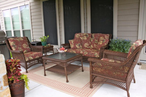 I looked and looked and finally found the perfect set and couldn’t be more happy! This is heavy wicker too…not like some of the other wicker sets I’ve seen where it seems they will blow away with a gust of wind. Now granted, the cushions are not my first pick, but that’s what came with the set and they are still in great condition. I hope to find some on sale this year, but gosh, patio cushions are amazingly expensive! And I can’t even find some big enough that fits this set. These are like extra wide and deep seats. Even the deep seat cushions that I have found at a few stores aren’t the same size as these and wouldn’t fit right. Weird. But the faux coral centerpiece looks great out here!