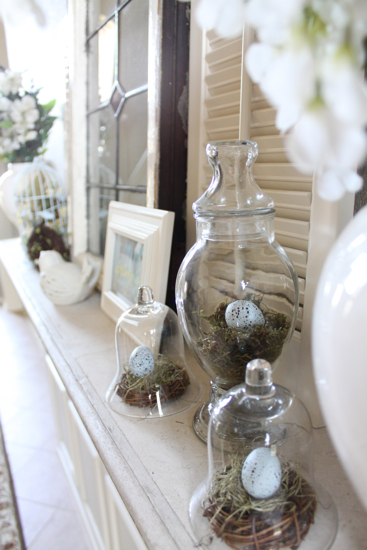 I love your garden bird themed mantel! Ohhh…I also love your new wall color and was thinking how beautiful your pretty white mantel shelf looks against it! Also a beautiful background for those large white vases…simply gorgeous! I like how you used the bird nests and eggs in the apothecary jar and cloches…very pretty! You certainly created a beautiful spring vignette! Thank you for sharing it with us for Beth’s mantel party today!