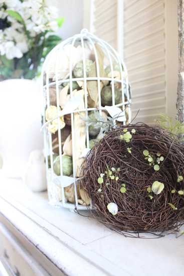 Ooooh! So pretty! I just love the mantel! Every time I visit, it looks beautiful. The new paint color is fab too! I love the birdies and the eggs. So springy!