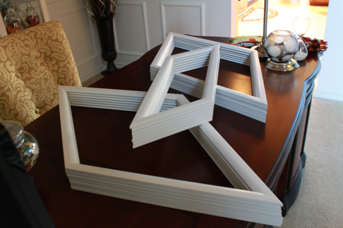 He took all of the frames that were to go on the left wall and cut them on each side, then added an “extender” piece of molding. So now the frames on that side are balanced with the wall. Gosh are you still reading? I know this is all pretty technical and I’m sorry. But just letting you know that if you run into problems, they probably can be fixed!