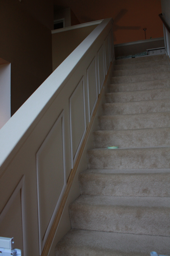 I am about to start this project but the boxes for the wainscotting are going in a hallway on a textured wall. I see you used very simple moulding, which I like more than the beveled ones that I think look nice in a very formal dining room. I am sure the simpler the molding the less the cost ( another advantage:) What I would like to know is what width the molding is or should be. At stores, they can in varying widths. I want it to look ptoportional, not so small it gets lost, but not so large it overpowers. Would appreciate your input. Your staircase looks incredible. If my upstairs hall looks good, I will be attempting the staircase.