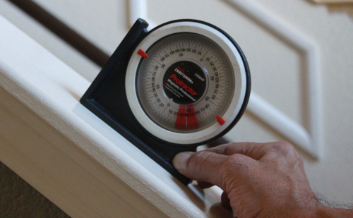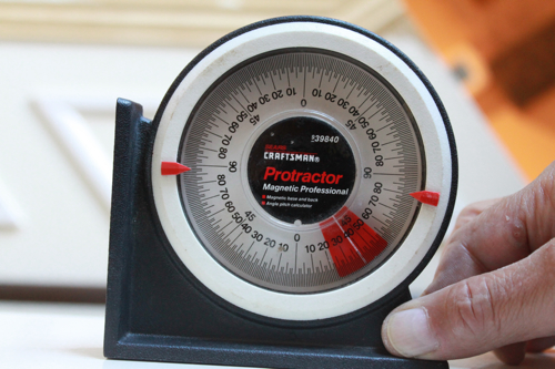When you are trying to do wainscoting up a staircase, you are going to have odd angles and cuts. But this new little gadget my Dad introduced me to is so cool. You just set it on your angle, say for instance our staircase banister, and it tells you exactly what angle it’s sitting at.