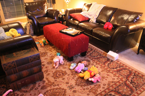 And no, I didn’t line up those animals/babies and shoe on the floor like that. Maybe she is type A personality? Oh, and I’ve made a few minor changes to the living room which I’ll show you soon.