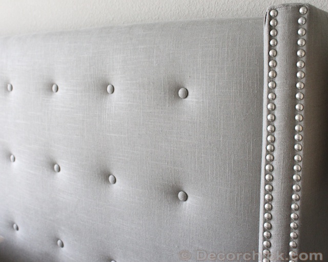 It is all real heavy duty nailhead too. The fabric is a grey linen and it’s so pretty. Nester has this exact same bed and I did ask her how she liked it before I bought ours. She loved it too and we both did end up having an issue with a screw hole stripped on the headboard, but her husband fixed that up and we got ours fixed too. Not a big deal.