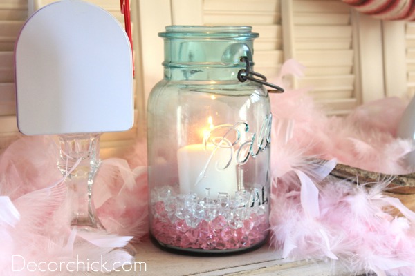 I also used the same aqua mason jars as I did last year and filled them up with pink and clear beads and popped a candle in.