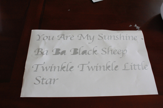 For this project I used the new premium frosted glass vinyl. Love this stuff. First I just chose a font that I liked and typed out the songs I wanted to use, and then printed them out.