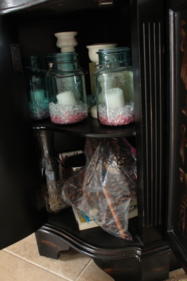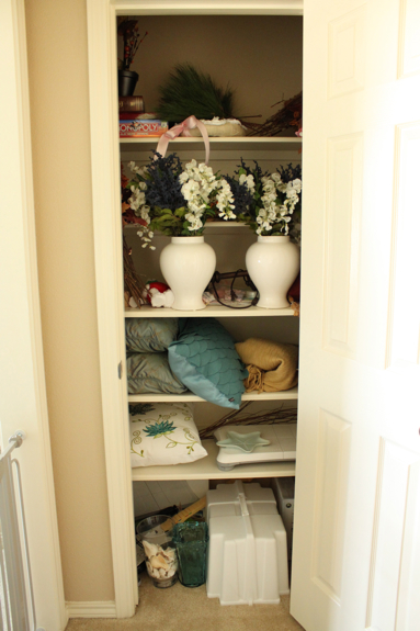The upstairs of our house has a ton of closets, and the one just at the top of the stairs in the hallway has become the decor closet. Candles, crafts, fake plants, glass items, vase fillers and all go there to hibernate until it’s their turn to be on display again. I like it that way. :-)
