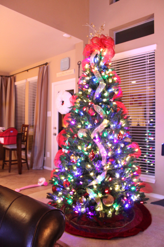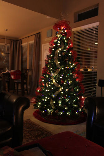Beautiful tree…I love the lights! My tree is pre-lit and has the pinkish lights instead of bright red and it’s kind of sad. BTW, what color paint is on your walls? I love the shade of brown!